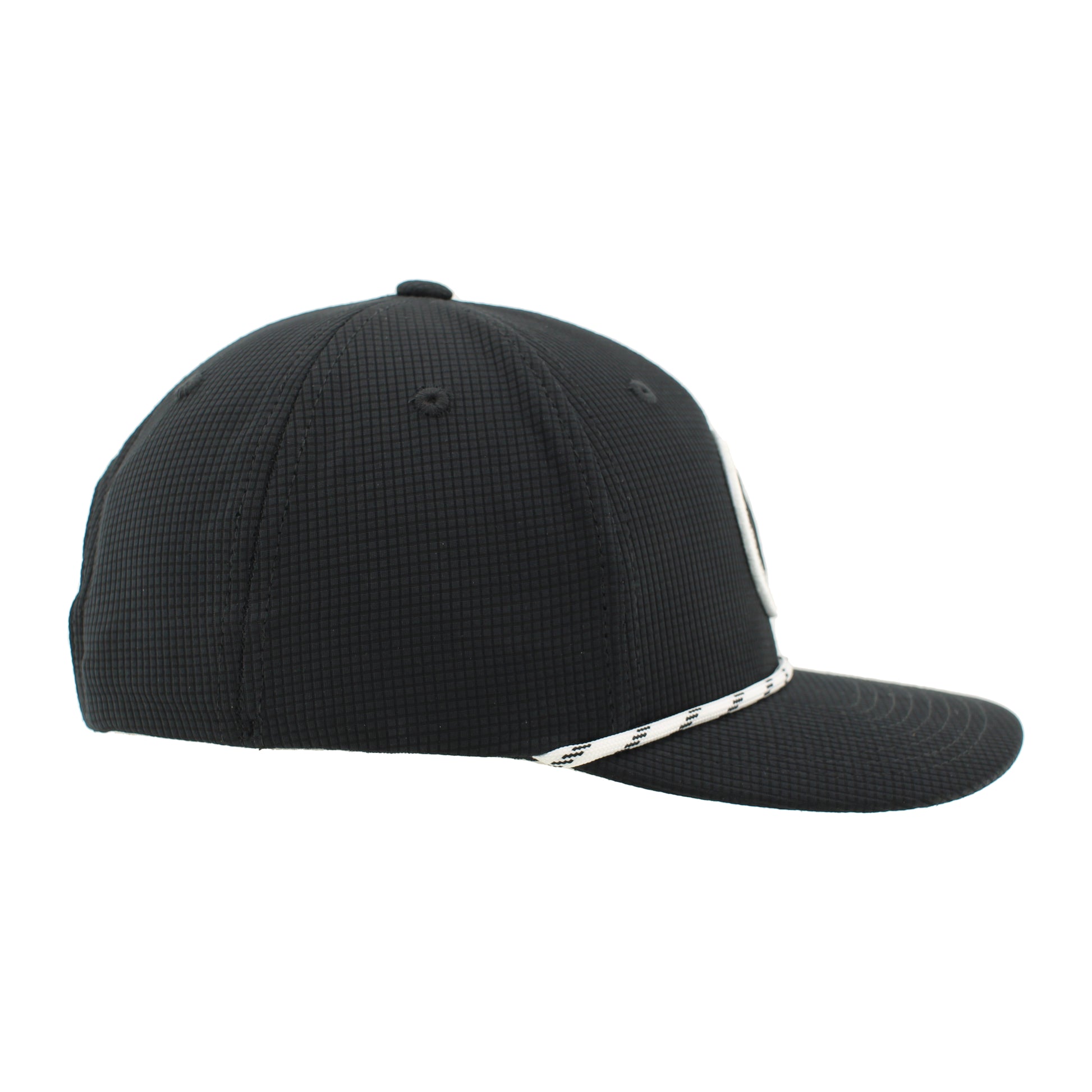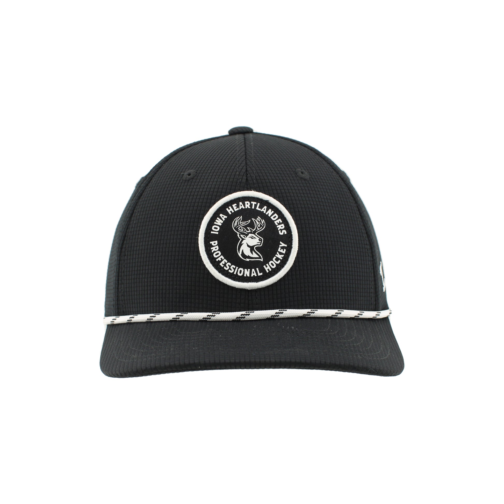 This rope hat features a sleek all-black design with the "Iowa Heartlanders Professional Hockey" name and deer logo printed on a front patch. Combining sporty and classic style, it has a solid color structure with a semi-curved iron grid visor accented by a paracord rope. The adjustable back with two-tone plastic snaps ensures a comfortable, personalized fit.